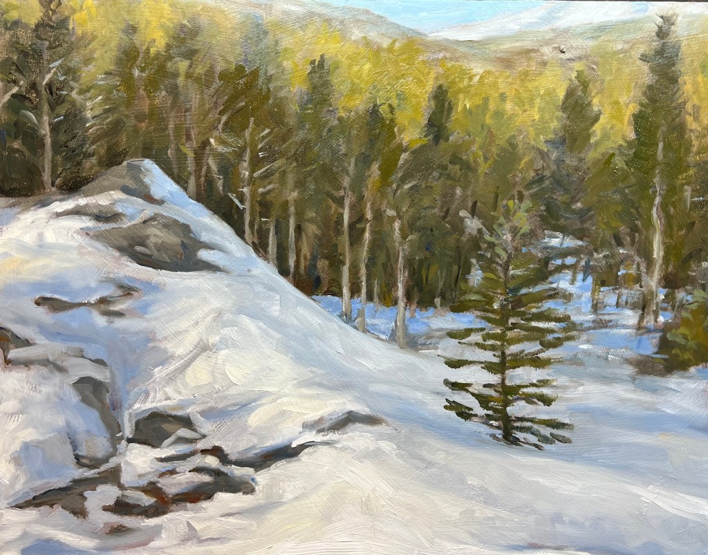 I expanded on the earlier small sketch to include some light striking the trees above the immediate scene. This was tricky light: the sky was cloudy in parts which sometimes diffused the light and sometimes illuminated portions of the landscape. The snow picked up color from reflected light. The rocks not covered by snow created unique patterns against white powder.