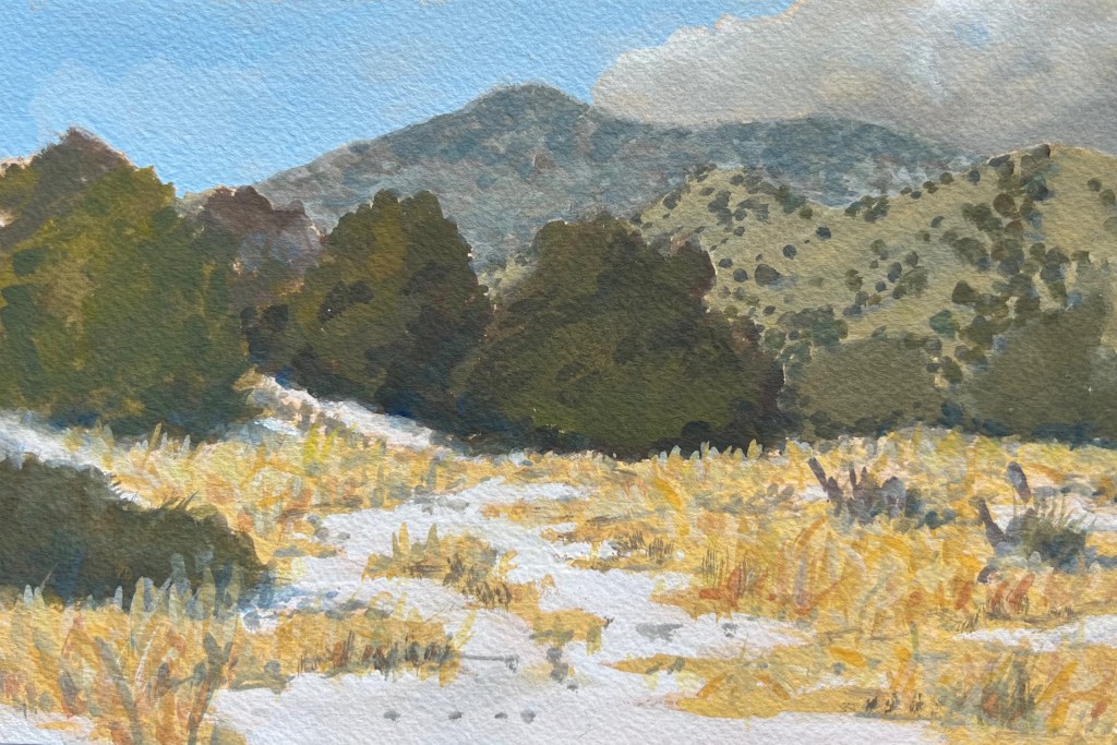 In mid-February 2024 I drove down to northern New Mexico to paint at Ghost Ranch and the hills around Abiquiu. On route I pulled off the back roads and painted this scene en plein air. It’s at the entrance to Burro Springs hunting area near La Garita. Beautiful colors. Beautiful country.