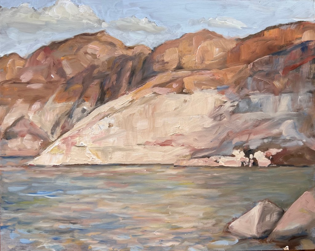 2024; Oil on panel; 8×10. A plein air study from the deck of a friend’s houseboat as we floated on Lake Powell this past week. The cliffs in Lake Powell are surreal. First, their color is intense. Secondly, the rock shapes are smoothed and rounded by the wind and water erosion. Third, there are both vertical and horizontal bands of color. The stone itself (coupled with high-water marks called “bathtub rings”) produces strong horizontal bands in the sedimentary rock. Now add vertical elements like cracks in the rock and red and/or black mineral stains that streak down the rockface. I find I have to mute the color of rock quite strongly or it just looks fake. Now add the complexity of those cliff reflections in the smooth waters of Lake Powell. It’s tricky to nail.