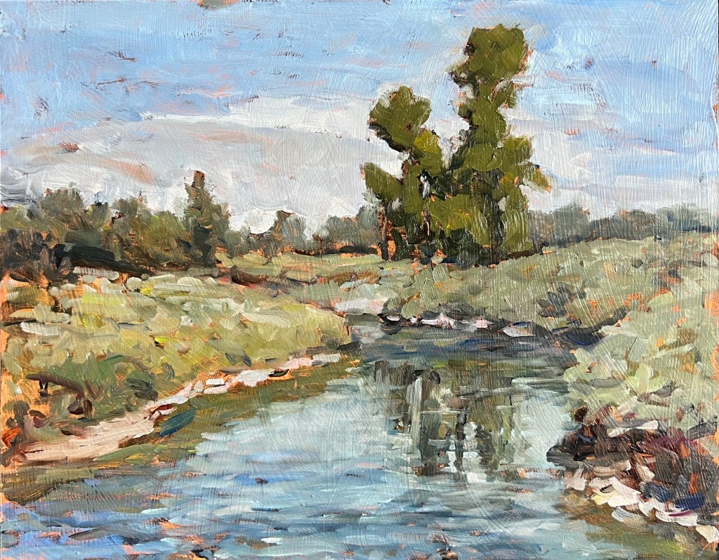 2024; oil on panel; 11×14. I was incorporating a “cross” composition using the reflection of the cottonwood trees in the river as the lower post of the cross.