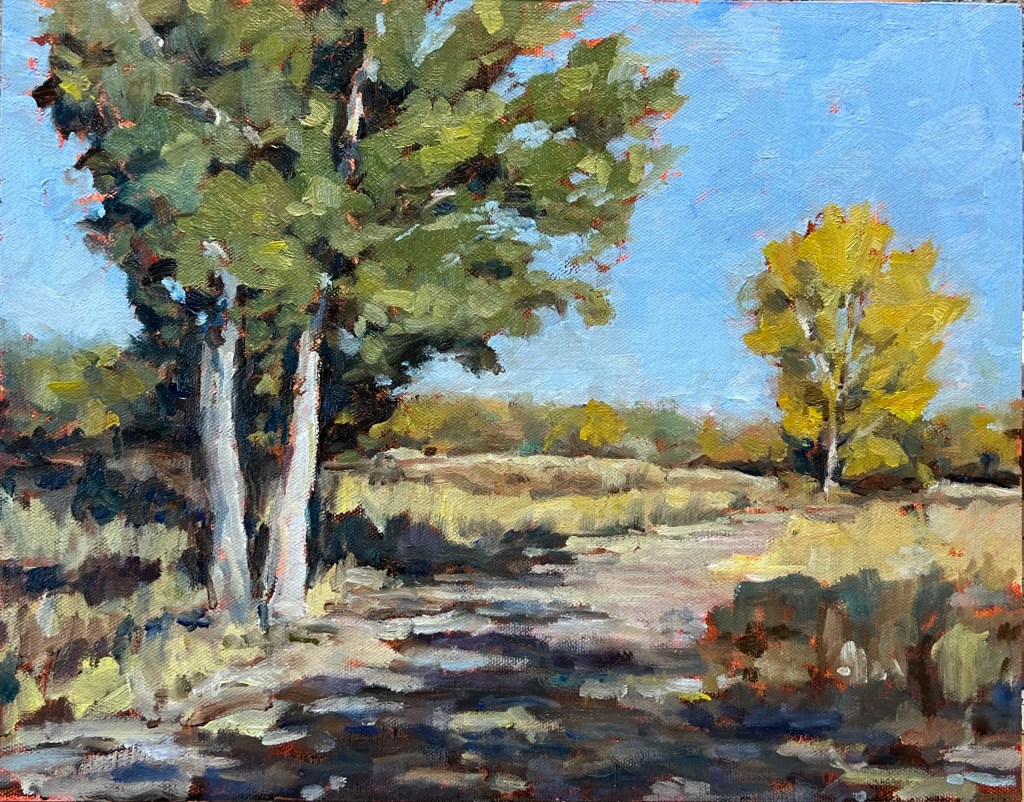 2024; oil on panel; 11×14. This site is a few miles from my home in Denver. It’s such lovely weather here now, crisp days with cool evenings, trees in full color. I just had to get out again and paint in the late afternoon. En plein air.
