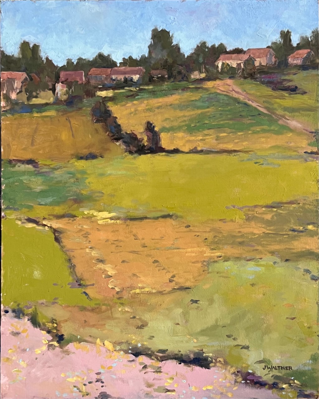 2025; oil on panel; 16×20. Painted en plein air with my Plein Air Painters of Colorado (PAAC) group. I was exploring the abstract patterning of fields sprouting new greenery in the spring, working on a larger scale.