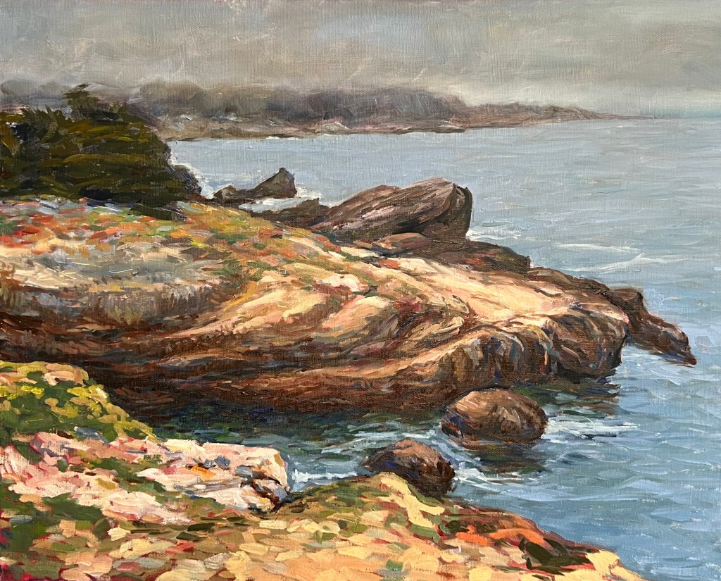 2025; oil on canvas; 16×20. This is a larger studio painting from a field sketch I did en plein air in June. The atmospheric conditions and the colors of both vegetation and the ocean are different for me, so altogether this presented a nice challenge.